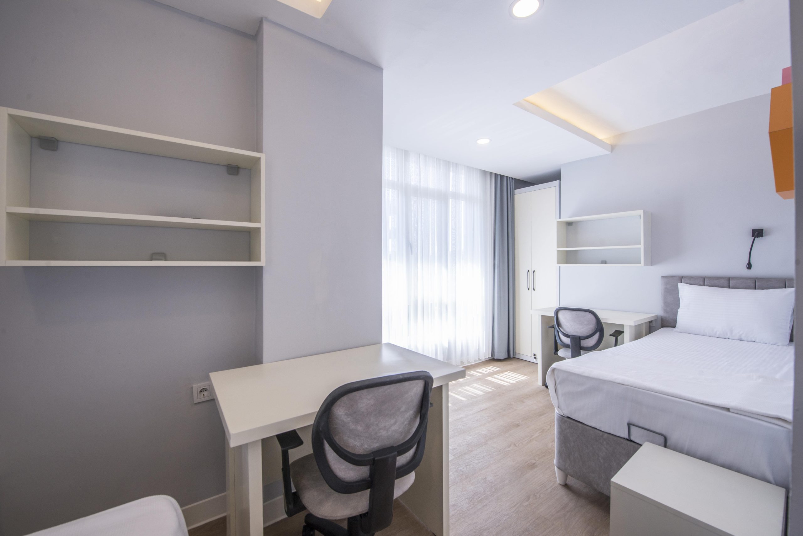 Geniş ve ferah yapısıyla dikkat çeken bu odalarda, birlikte yaşam kültürü desteklenirken her öğrencinin bireysel konforu da gözetilir. Ortak kullanım alanlarının düzenli planlaması ve kişisel alanların dengeli ayrımı sayesinde, hem sosyal etkileşim hem de bireysel verimlilik bir arada sağlanır. Santral Kız Öğrenci Yurdu’nda dört kişilik odalar, aidiyet duygusunu güçlendiren sıcak ve düzenli bir yaşam alanı sunar.